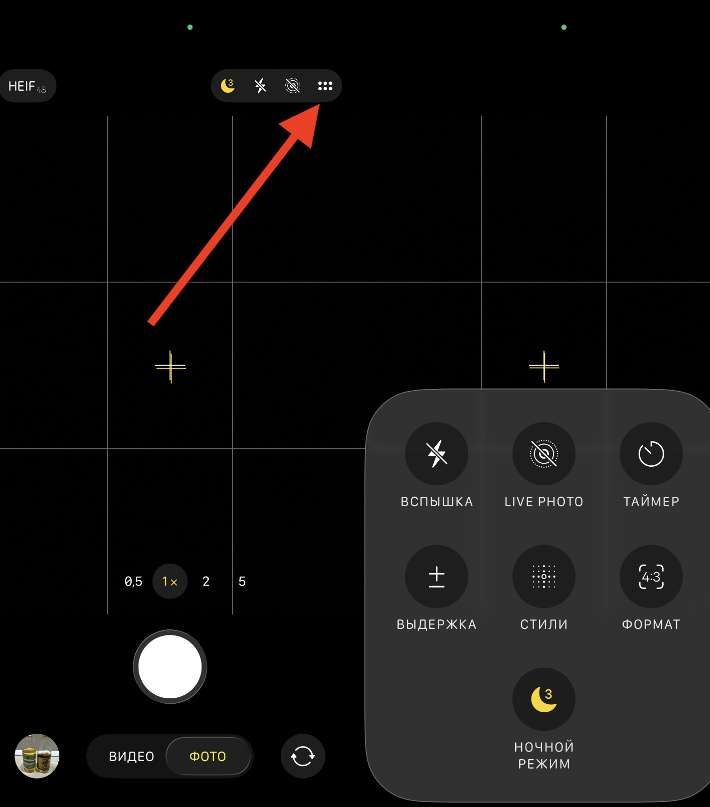 - Откроется список элементов: вспышка, Live Photos, таймер, соотношение сторон, стили и управление режимом макросъемки и ночной съемки.